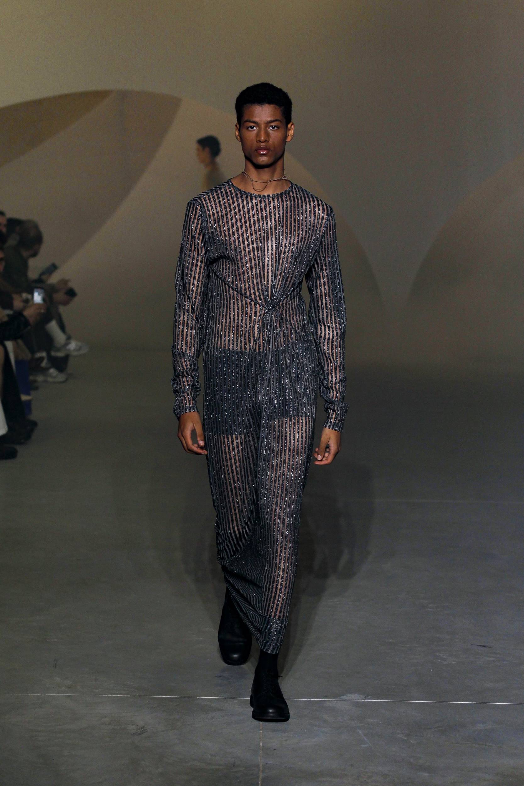 Los materiales que componen la colección proceden de la reutilización de restos de colecciones pasadas y otros de material muerto, creando una perfecta combinación de texturas en prendas que le dan un gran giro a la formalidad de la silueta masculina, enmarcada por el desenfado de cortes oversize en abrigos y pantalones anchos.