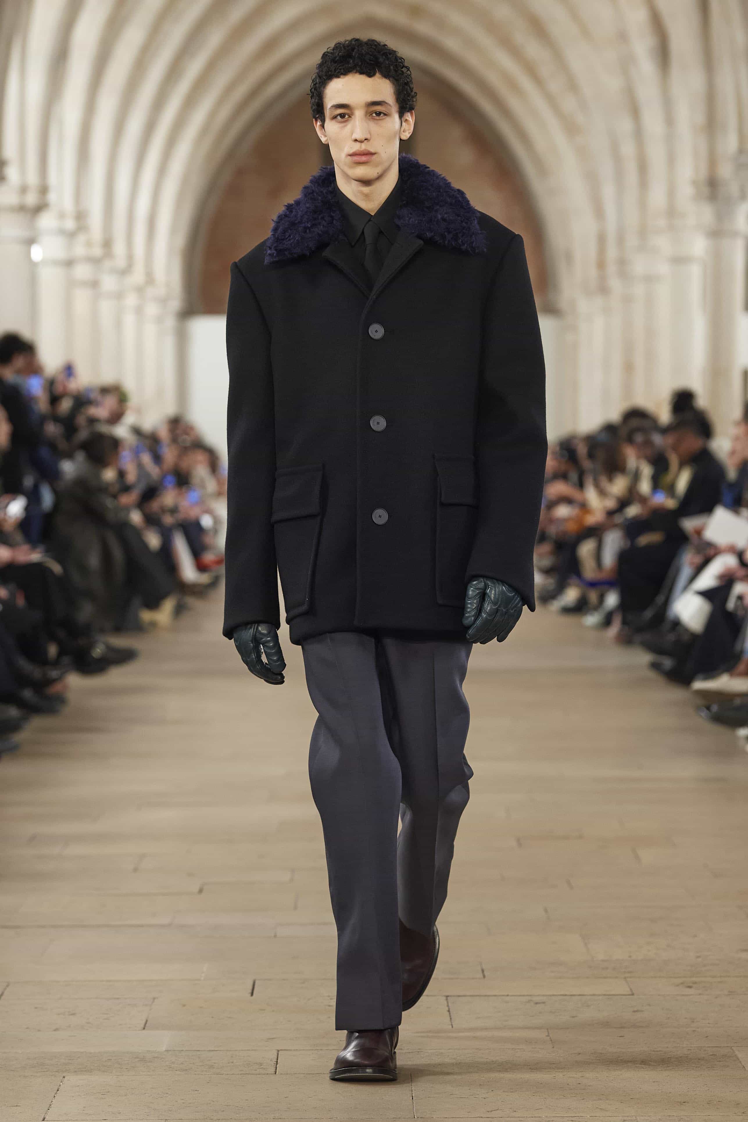 Piezas de abrigo de doble botonadura, chaquetas de silueta de caja y pieles se llevan la atención en un desfile donde los tonos oscuros y vivaces destellos de color se llevan el total protagonismo, sumándose a pantalones formales de aires clásicos y modernas piezas de punto.