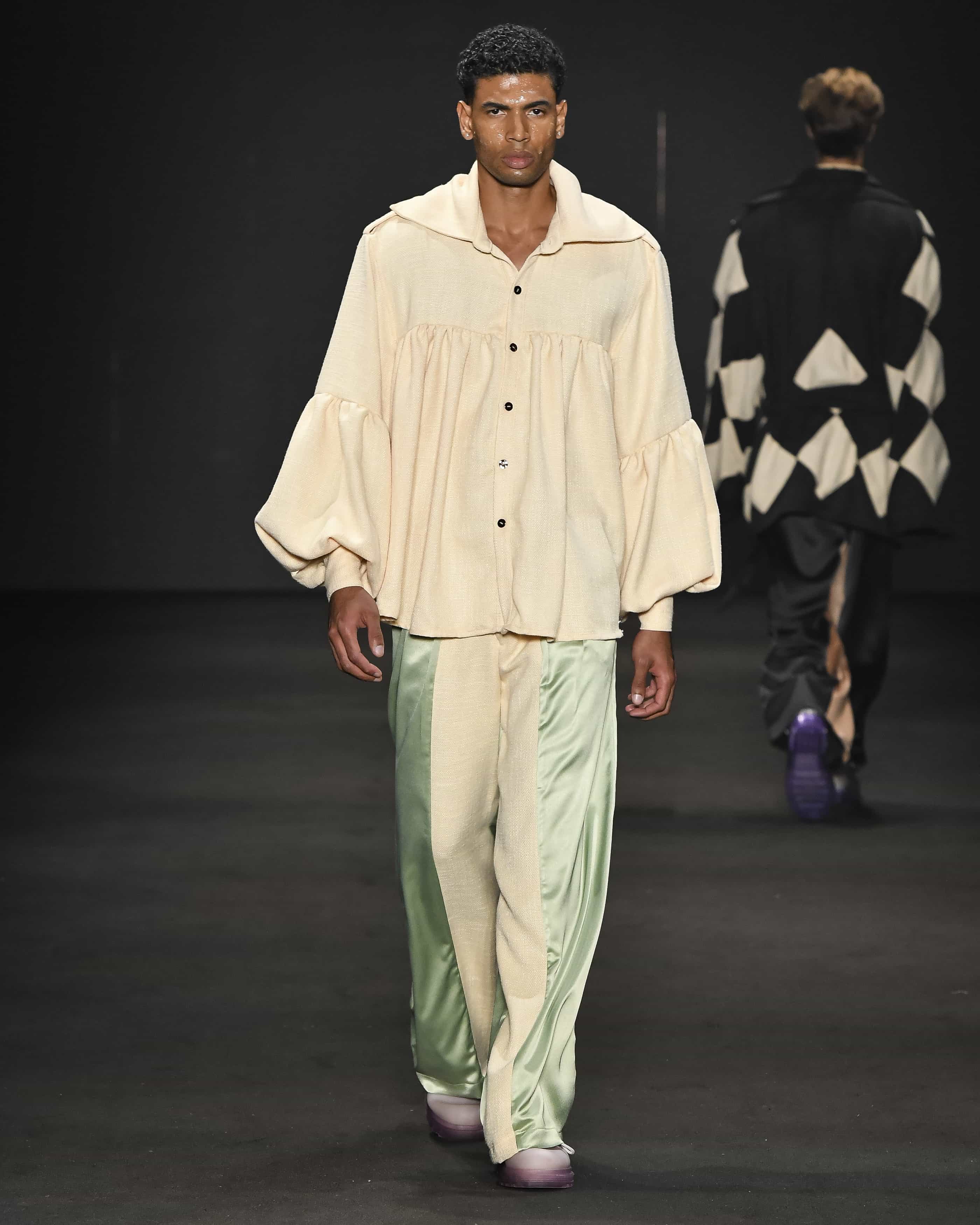 Rafael Caetano ocupó el espacio en Senac Lapa Faustolo, donde ofreció un acercamiento queer y nocturno a esa mezcla de sastrería y streetwear que ha sido tendencia en el segmento.
